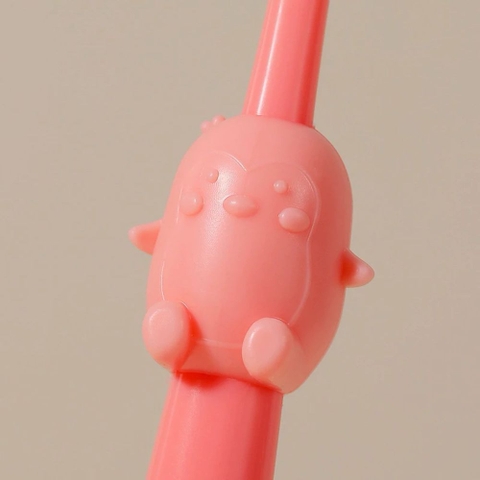 Thiết kế công thái học và hình dáng sinh động Sản phẩm gây ấn tượng mạnh với trẻ nhỏ nhờ tạo hình chú chim cánh cụt 3D nổi bật trên thân bàn chải. Không chỉ đơn thuần là trang trí, phần thân này được thiết kế to bản, vừa vặn với lòng bàn tay của trẻ từ 2 đến 6 tuổi, giúp bé dễ dàng cầm nắm và điều khiển bàn chải mà không bị trơn trượt. Màu sắc tươi sáng như vàng, hồng và xanh dương kích thích thị giác, biến giờ đánh răng mỗi ngày thành một trò chơi thú vị.