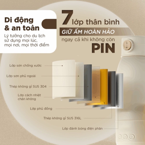 Nhờ cấu trúc 7 lớp ưu việt này, bình có khả năng giữ ấm hoàn hảo ngay cả khi thiết bị đã hết pin. Đây là tính năng vượt trội giúp mẹ luôn có sẵn nước ấm để pha sữa cho bé trong những hành trình dài mà không cần lo lắng về nguồn điện.