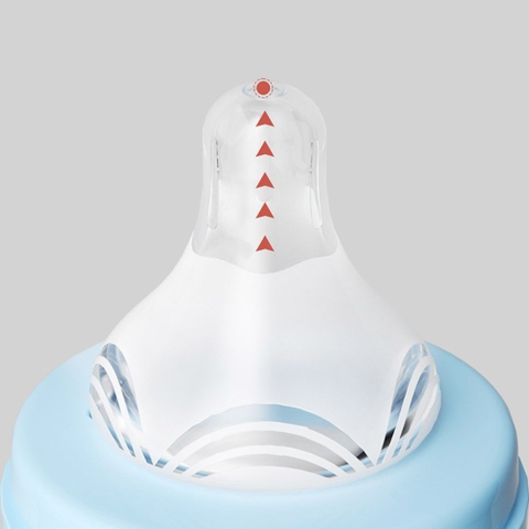 Núm ty silicone siêu mềm, mô phỏng ty mẹ: Núm ty được làm từ silicone y tế siêu mềm mại, độ đàn hồi cao, thiết kế bầu vú rộng, mô phỏng hình dáng và cảm giác như ty mẹ. Điều này giúp bé dễ dàng thích nghi khi chuyển từ bú mẹ sang bú bình hoặc bú song song, tạo cảm giác thoải mái và an tâm như đang trong vòng tay mẹ. Bề mặt núm ty có các đường gân nổi giúp bé ngậm chặt, hạn chế không khí đi vào.