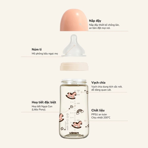 Bình sữa PPSU Ubmom họa tiết Ngựa là dòng sản phẩm cao cấp đến từ Hàn Quốc, được thiết kế chuyên biệt để mang lại trải nghiệm bú bình tự nhiên và an toàn nhất cho trẻ nhỏ. Với chất liệu nhựa PPSU tiên tiến cùng hệ thống van thông khí thông minh, sản phẩm là lựa chọn hàng đầu của các bà mẹ hiện đại trong việc chăm sóc sức khỏe hệ tiêu hóa và sự phát triển của bé.