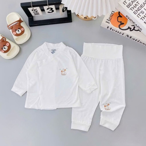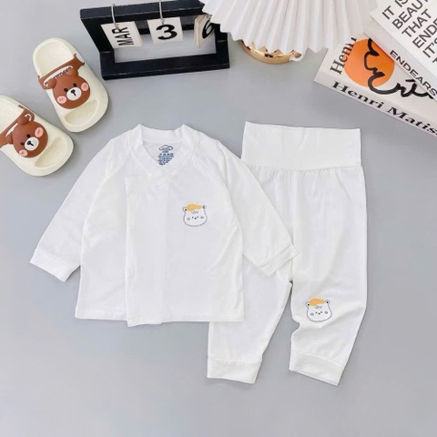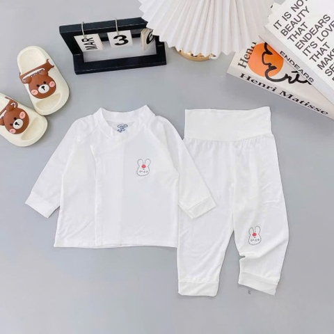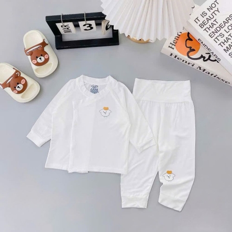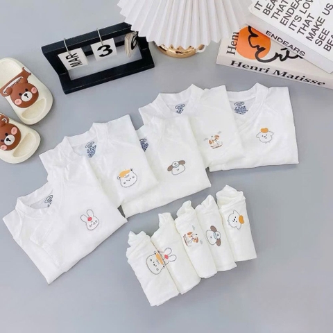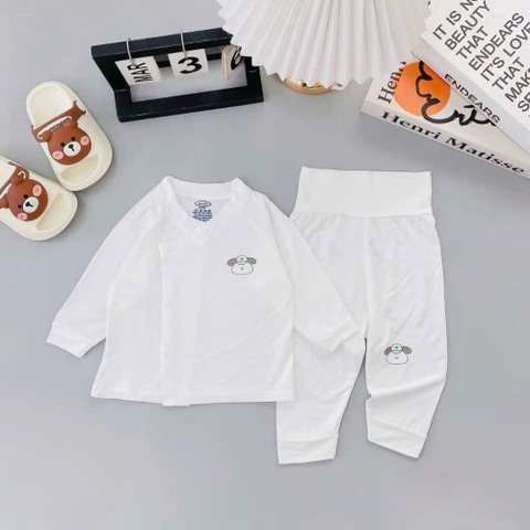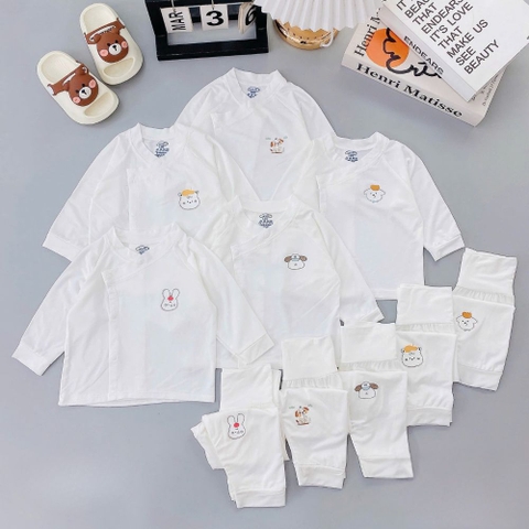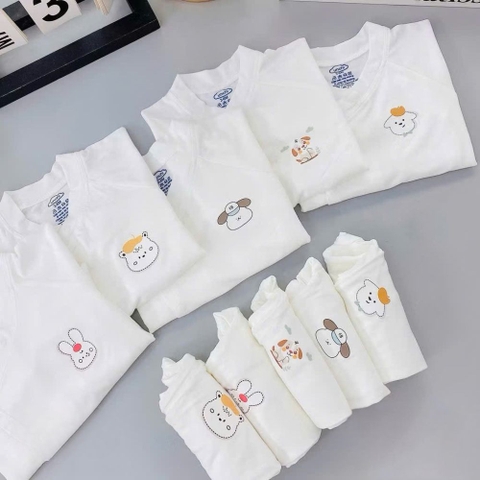Họa tiết ngộ nghĩnh: Bộ quần áo có nền trắng tinh khôi, kết hợp với các họa tiết động vật đáng yêu như thỏ, gấu, chó, cừu... được in sắc nét và bền màu. Những họa tiết này không chỉ tạo điểm nhấn đáng yêu cho trang phục mà còn kích thích thị giác của bé.