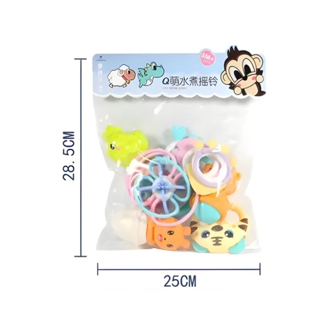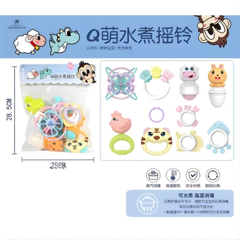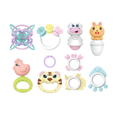 Bộ sản phẩm gồm 10 chi tiết với hình dáng các con vật ngộ nghĩnh (hổ, gà, cừu, thỏ, v.v.), vòng gặm nướu và xúc xắc nhiều màu sắc pastel nhẹ nhàng.