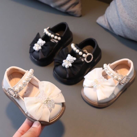 Giày da tập đi 2 nơ vải mềm chống trượt cho bé gái