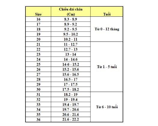 Tiếp theo, bạn hãy so với bảng size giày dưới đây để chọn size giày chuẩn cho con nhé: