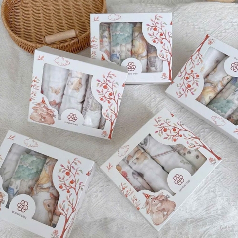 Đóng gói hộp quà lịch sự Mỗi bộ sản phẩm bao gồm 4 khăn được đóng gói trong hộp giấy trang nhã có cửa sổ trong suốt. Đây là lựa chọn hoàn hảo để làm quà tặng đầy tháng, quà tặng sơ sinh cho bạn bè và người thân.