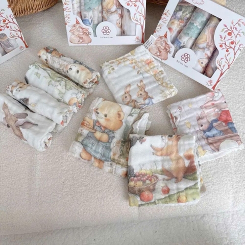 Họa tiết cổ tích tinh tế và sang trọng Điểm khác biệt lớn nhất của dòng khăn Bubble Tree chính là các hình in mang đậm chất nghệ thuật phương Tây. Những hình ảnh chú thỏ, gấu, sóc và khung cảnh rừng xanh được vẽ theo phong cách màu nước nhẹ nhàng, kích thích thị giác và mang lại cảm giác dễ chịu cho cả mẹ và bé. Công nghệ in an toàn, màu sắc bền bỉ theo thời gian.