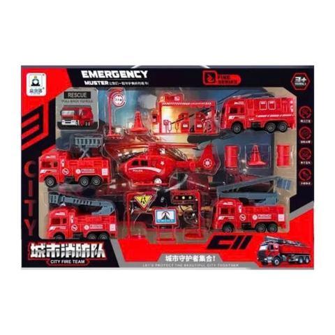 Bộ sản phẩm bao gồm đầy đủ các loại xe chuyên dụng: Xe cứu hỏa thang (có thể nâng hạ/xoay thang), xe bồn chở nước, xe chở thiết bị cứu hộ, và trực thăng cứu hộ màu đỏ.