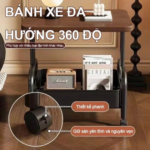 2. Thiết kế thông minh 2 trong 1 Sản phẩm là sự kết hợp độc đáo giữa kệ lưu trữ và bàn làm việc mini. Tầng trên cùng là mặt ván gỗ dày dặn với vân gỗ tự nhiên, tạo bề mặt phẳng rộng rãi để đặt đèn ngủ, máy tính bảng, tách cà phê hoặc các đồ trang trí. Hai tầng dưới được thiết kế dạng khay sâu bằng lưới thép, giúp đồ vật không bị rơi ra ngoài và đảm bảo sự thông thoáng, tránh ẩm mốc.