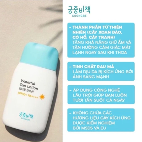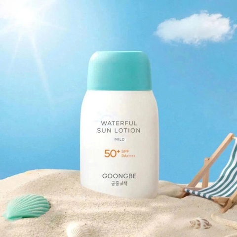 Kem Chống Nắng Goongbe Waterful Sun Lotion Mild (Dạng Sữa Dịu Nhẹ) là giải pháp bảo vệ da toàn diện, lý tưởng cho trẻ em từ 6 tháng tuổi và cả gia đình trong mọi điều kiện thời tiết, đặc biệt khi đi biển hoặc hoạt động ngoài trời. Sản phẩm được nghiên cứu và phát triển bởi thương hiệu chăm sóc da trẻ em hàng đầu Hàn Quốc Goongbe (Cung Tranh), nổi tiếng với các sản phẩm an toàn, có nguồn gốc từ thiên nhiên.
