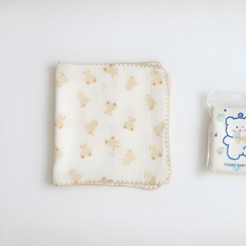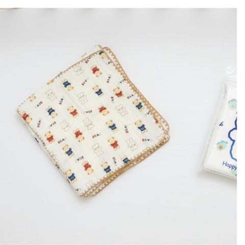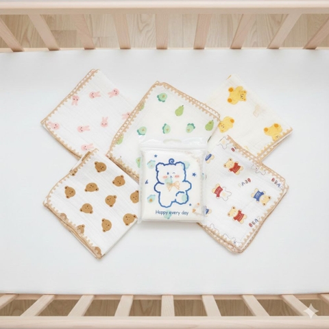 Đóng gói túi Zip gấu tiện lợi Mỗi chiếc khăn được đựng trong một túi zip riêng biệt có in hình gấu "Happy Every Day". Thiết kế này giúp bảo quản khăn luôn sạch sẽ, tránh bụi bẩn và cực kỳ thuận tiện khi mẹ cần mang theo trong túi xách khi đưa bé ra ngoài, đi tiêm chủng hay đi du lịch.