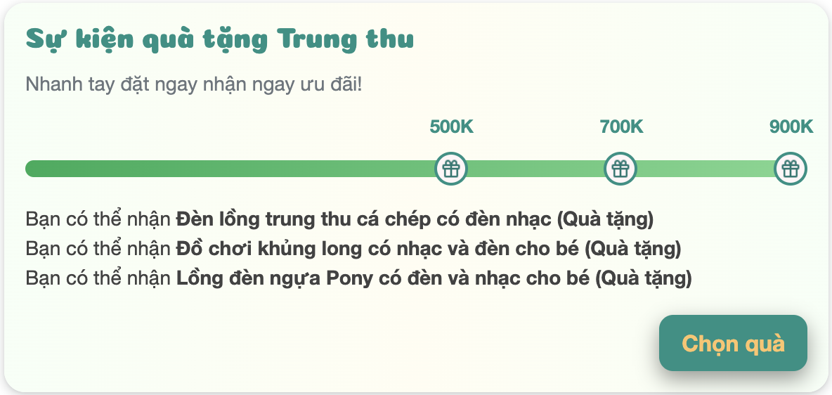 - Đơn hàng từ 700.000đ trở lên: Được tặng lồng đèn khủng long - tượng trưng cho sức mạnh và phát triển.