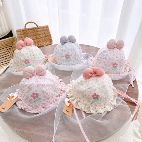 Họa tiết và màu sắc nhã nhặn Sản phẩm sử dụng họa tiết hoa nhí li ti - xu hướng bền vững trong thời trang trẻ em. Các gam màu pastel như hồng phấn, kem sữa, ghi sáng giúp tôn lên làn da trắng hồng của các bé. Trên đỉnh mũ thường được trang trí thêm nơ thắt điệu đà, tạo điểm nhấn xinh xắn như một nàng công chúa nhỏ.