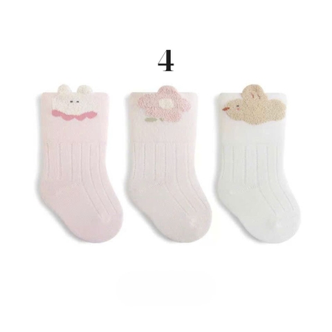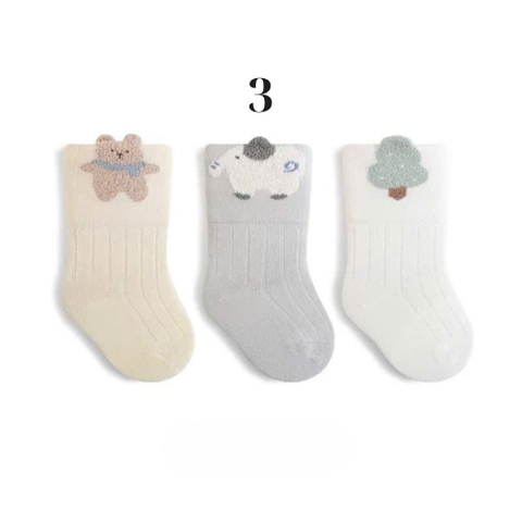 Bộ sản phẩm bao gồm 3 đôi tất với nhiều họa tiết ngộ nghĩnh, đáng yêu như gấu, thỏ, hoa, đám mây, mang lại vẻ ngoài xinh xắn cho bé. Thiết kế cổ tất cao vừa phải, không chỉ giữ ấm mà còn giúp tất không bị tuột khi bé di chuyển. Đường may tỉ mỉ, chắc chắn, không có chỉ thừa, đảm bảo độ bền và an toàn cho bé khi sử dụng.
