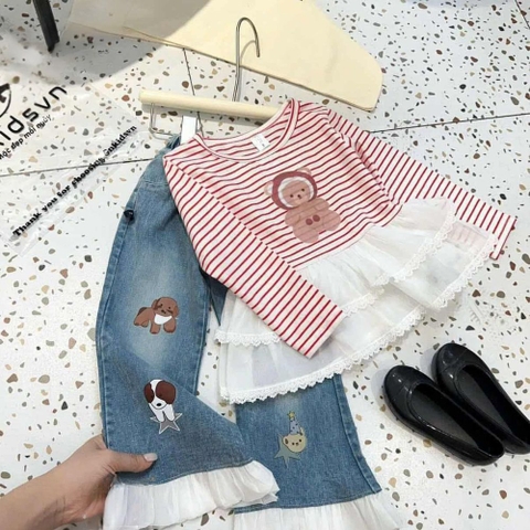 Set Bộ Dài Tay Gấu Kẻ Đỏ Phối Quần Jean Loe Bèo Cho Bé Gái - Thời Trang Thu Đông Sành Điệu