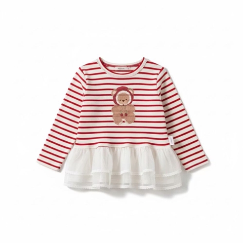 • Thiết kế: Áo thun kẻ ngang màu đỏ và trắng tạo điểm nhấn nổi bật, mang lại cảm giác tươi mới, rạng rỡ. Họa tiết hình gấu teddy nhỏ nhắn thêu đắp trước ngực vô cùng dễ thương và ngộ nghĩnh.