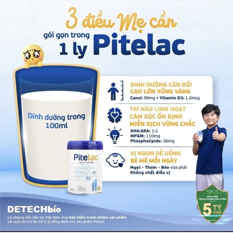 Sữa bột Pitelac là sự lựa chọn tin cậy cho những người mẹ mong muốn mang lại nền tảng sức khỏe và trí tuệ vững chắc nhất cho con yêu. Với cam kết bảo hiểm trách nhiệm sản phẩm lên tới 5 tỷ đồng từ Detech Bio, các bậc phụ huynh hoàn toàn có thể yên tâm về chất lượng và độ an toàn của sản phẩm.