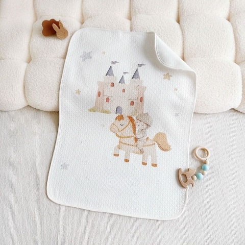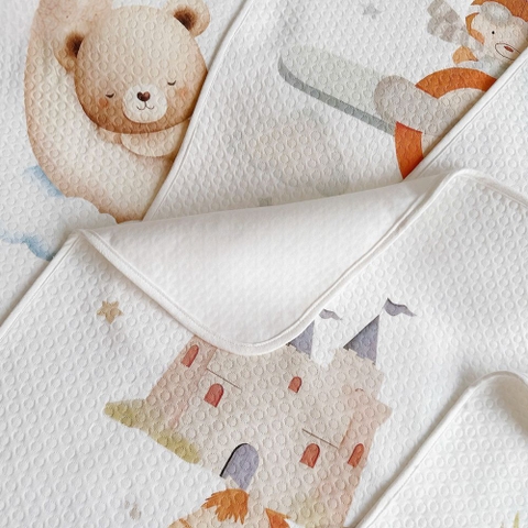 3. Họa tiết cổ tích tinh tế Bộ sưu tập sở hữu những hình in mang phong cách màu nước nhẹ nhàng như chú thỏ hoa, lâu đài cổ tích, gấu ngủ trăng hay kỵ sĩ cưỡi ngựa. Những hình ảnh này không chỉ kích thích thị giác của bé mà còn tạo nên một thế giới diệu kỳ ngay trên chiếc giường nhỏ.