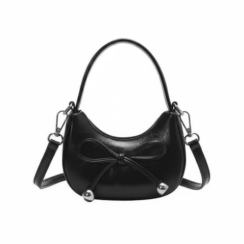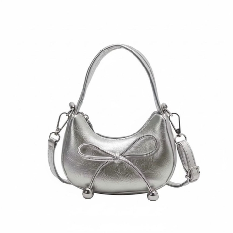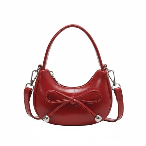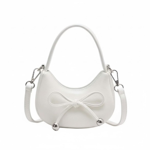 1. Thiết kế mang tính thẩm mỹ cao Túi có kiểu dáng uốn cong mềm mại, tạo cảm giác nhẹ nhàng và nữ tính. Điểm nhấn trung tâm là chiếc nơ được thắt tỉ mỉ, cố định bằng các hạt kim loại tròn sáng bóng ở hai đầu dây nơ, tạo nên sự cân đối và bắt mắt.