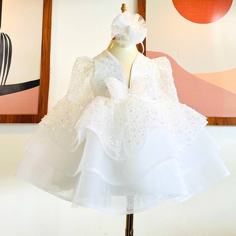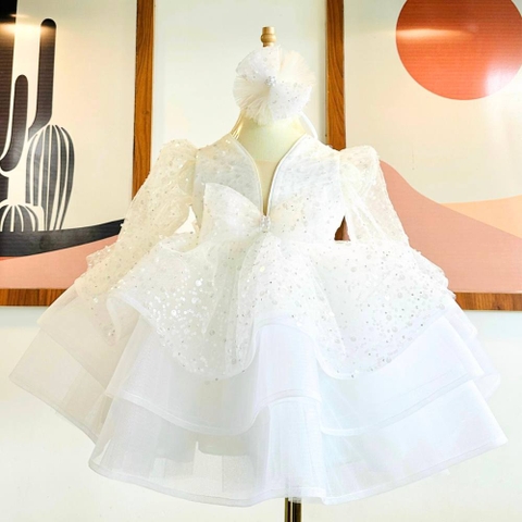 Về thiết kế, váy có kiểu dáng xòe tầng, giúp bé trở nên xinh xắn và đáng yêu. Phần thân trên của váy có cổ tròn, tay ngắn, mang lại sự thoải mái cho bé. Phần thân dưới của váy có nơ to ở eo, tạo điểm nhấn cho váy và giúp bé thêm nổi bật.