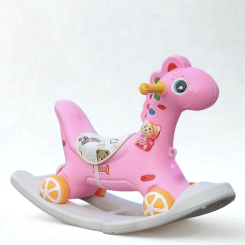 Thiết kế hình chú ngựa đáng yêu: Sản phẩm có hình dáng chú ngựa ngộ nghĩnh, màu sắc tươi sáng (hồng và xanh), thu hút sự chú ý của bé ngay từ cái nhìn đầu tiên. Đệm ngồi êm ái, bọc vải mềm mại in hình hoạt hình dễ thương, mang lại cảm giác thoải mái cho bé khi chơi.